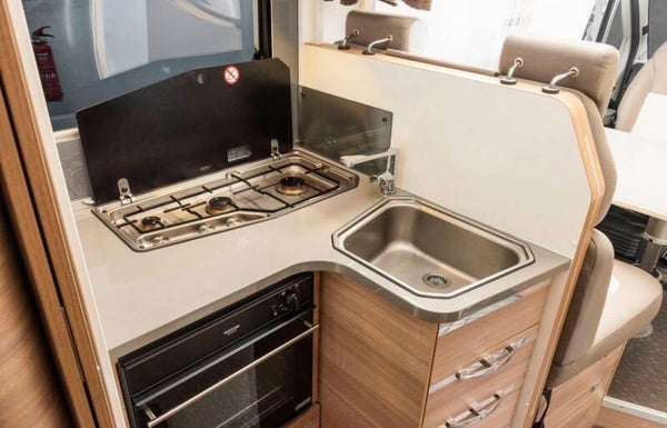 - Keukenblok met 3-pits gaskookplaat, oven en Trimix koelkast met vriezer van 140 liter
